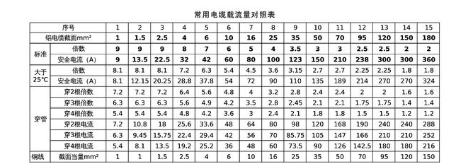 4、“条件有变加折算,高温九折铜升级”。上述口诀是铝芯绝缘线、明敷在环境温度25℃的条件下而定的。若铝芯绝缘线明敷在环境温度长期高于25℃的地区,导线载流量可按上述口诀计算方法算出,然后再打九折即可;当使用的不是铝线而是铜芯绝缘线,它的载流量要比同规格铝线略大一些,可按上述口诀方法算出比铝线加大一个线号的载流量。如2.5平方毫米铜芯线等于4平方毫米铝芯线,4平方毫米铜芯线等于6平方毫米铝芯线,6平方毫米铜芯线等于10平方毫米铝芯线。